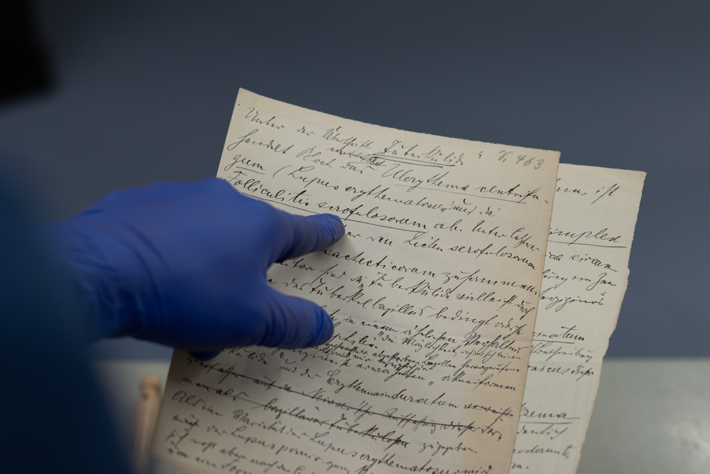 Die Entsäuerung von Beständen ist ein aufwändiges und kostenintensives Verfahren. Durch den Zuschlag für ein Drittmittelprojekt war es jedoch möglich, die Entsäuerung der Bestände in 2025 fortzuführen. Mit Hilfe der Förderung durch die Landesinitiative Substanzerhalt (LISE) und der Förderung der Koordinationsstelle zur Erhaltung schriftliches Kulturgut (KEK) hat ZB MED dieses Jahr medizinische Bestände aus der „Sammlung Hoffmann“ entsäuern können. Die Sammlung Hoffmann entstand aus der ehemaligen Privatbibliothek von Erich Hoffmann, einem Wissenschaftler und Mediziner, der 1905 zusammen mit Fritz Schaudinn das Bakterium treponerum pallidum entdeckte und damit den Auslöser der Syphilis identifizierte. Diese Bestände sind auch deswegen so wertvoll, da sie viele handschriftliche Notizen enthalten, die Aufschluss über den Prozess der Entdeckung des Syphilis-Erregers geben können.
